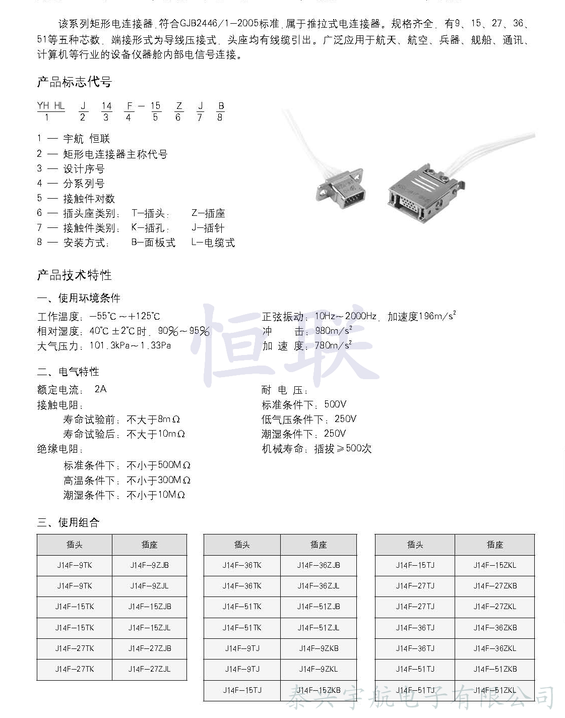 該系列矩形電連接器執(zhí)行Q/HD20037-2007詳細(xì)規(guī)范,屬于推拉式電連接器,規(guī)格齊全,有9,15,27,36,51等五種芯數(shù),端接形式為導(dǎo)線壓接式,頭座均有線纜引出,廣泛應(yīng)用于航天、航空、兵器、艦船、通訊、計算機(jī)等行業(yè)的設(shè)備儀器艙內(nèi)部電信號連接